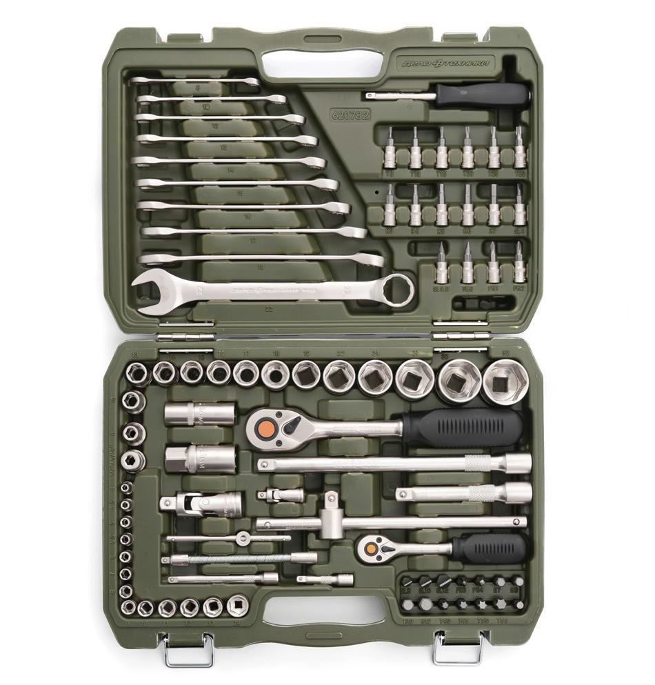 Набор инструментов 82 предметов в удобном чемодане подходит для ремонта автомобиля, мотоцикла и другой техники в гараже, мастерской, поездке или автопутешествии.