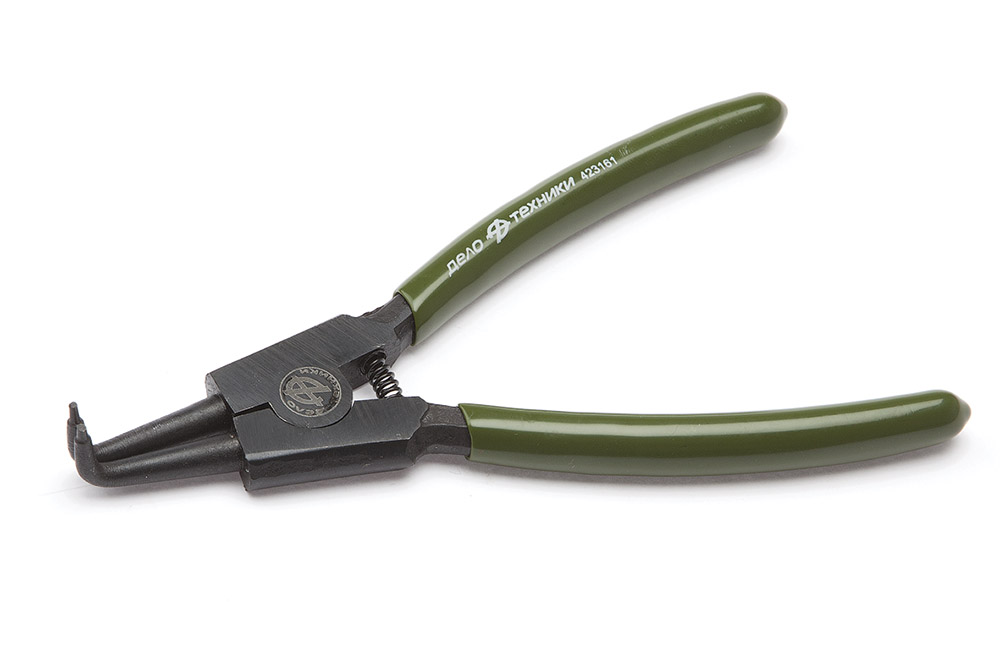 Загнутый съёмник стопорных колец применяется при монтаже и демонтаже наружных стопорных колец в труднодоступных местах. Работает на разжатие.