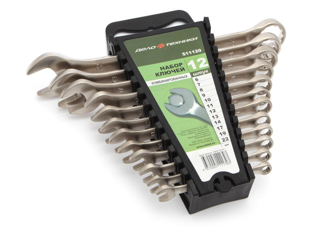 Классический вариант комбинированного гаечного ключа с рожковым профилем на одной стороне и двенадцатигранным накидным профилем на другой.