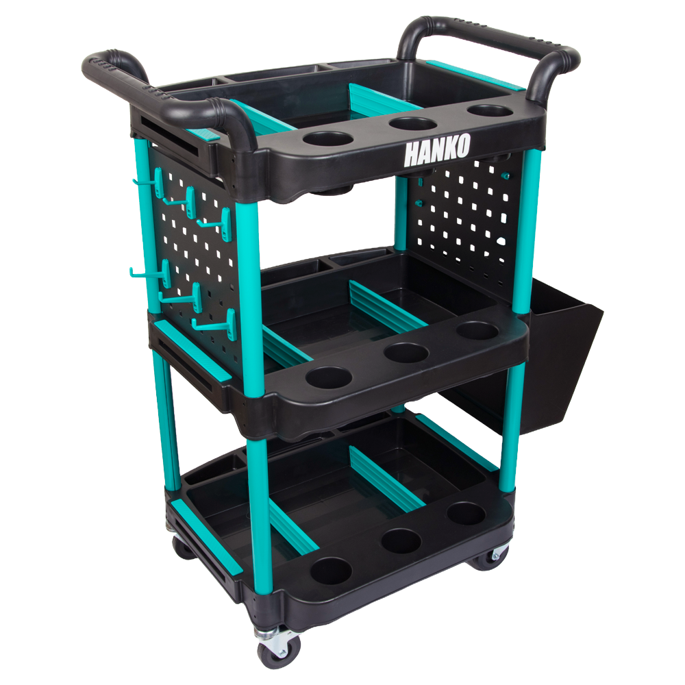 Тележка для детейлинга HANKO SP-2025-1102 — это мобильный органайзер, оптимизирующий рабочее пространство. Три прочные полки, каждая разделенная на три отсека, обеспечивают четкую классификацию и быстрый доступ к необходимым инструментам и аксессуарам. 18 ячеек на полках и две металлические стенки с отверстиями для крючков обеспечивают дополнительны зоны хранения. Функциональные колеса обеспечивают маневренность и оснащены стопорами для фиксации. Конструкция выполнена из прочного и долговечного пластика. Тележка может быть доукомплектована еще одним или несколькими вместительными пластиковыми контейнерами HANKO SP-2025-T10 для крепления по бокам.