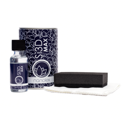 Nanolex Si3D MAX — передовое защитное покрытие Si3D для ЛКП и других внешних элементов кузова автомобиля, включая любые лакокрасочные поверхности, колёсные диски и детали из неокрашенного пластика. Состав формирует на обрабатываемой поверхности толстый защитный слой за счёт толстой сшитой полисилазановой матрицы, которая обеспечивает максимальные защитные свойства — выдающуюся прочность и долговечность, а также придает поверхности невероятный гидрофобный эффект и максимальные легко-очищаемые свойства.