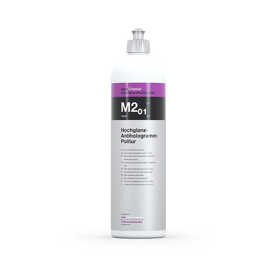 Микроабразивная антиголограммная политура для зеркального блеска с устранением эффекта «голограммы» без содержания силиконового масла. Не пылит. 100% удаление риски глубиной P3000, результат с высокой степенью блеска. Служит вторым и заключительным этапом полировки после абразивной пасты H8.01/F5.01. Эффективно работает с применением эксцентриковых машинок и специализированных поролоновых кругов от Koch-Chemie.